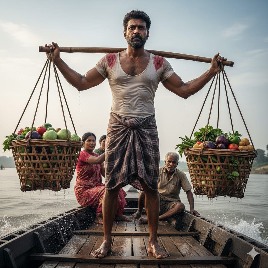 নৌকার উপর দন্ডায়মান একজন তাগড়া জোয়ান। বয়স চল্লিশশের কাছাকাছি। সুঠাম স্বাস্থ্য। শরীরে কঠোর পরিশ্রমের চিহ্ন। জোয়ান বেশ কর্মঠ ও শক্তিশালী।