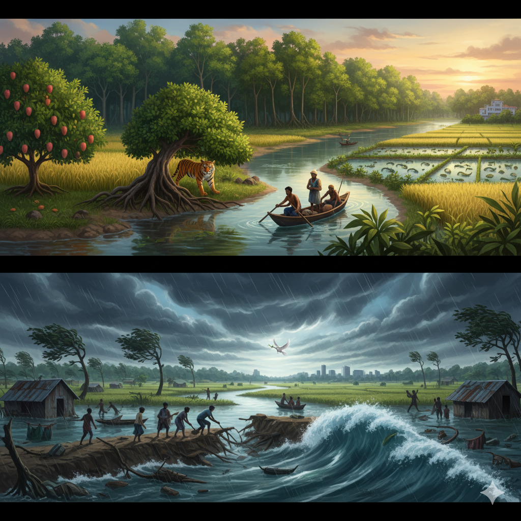 উত্তরে যশোর-দক্ষিণে সাগর মাঝে ম্যানগ্রোভ বনভূমি ।